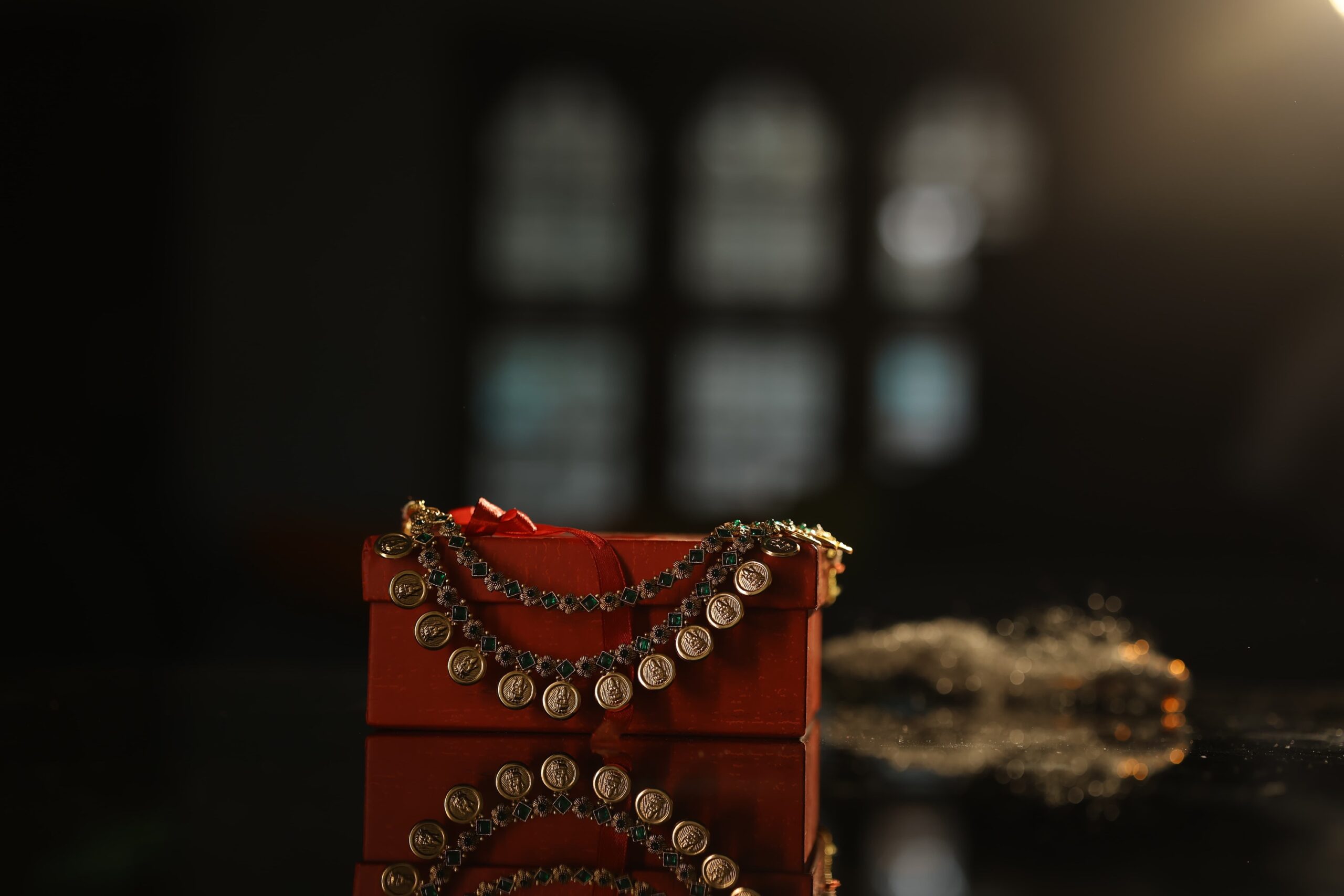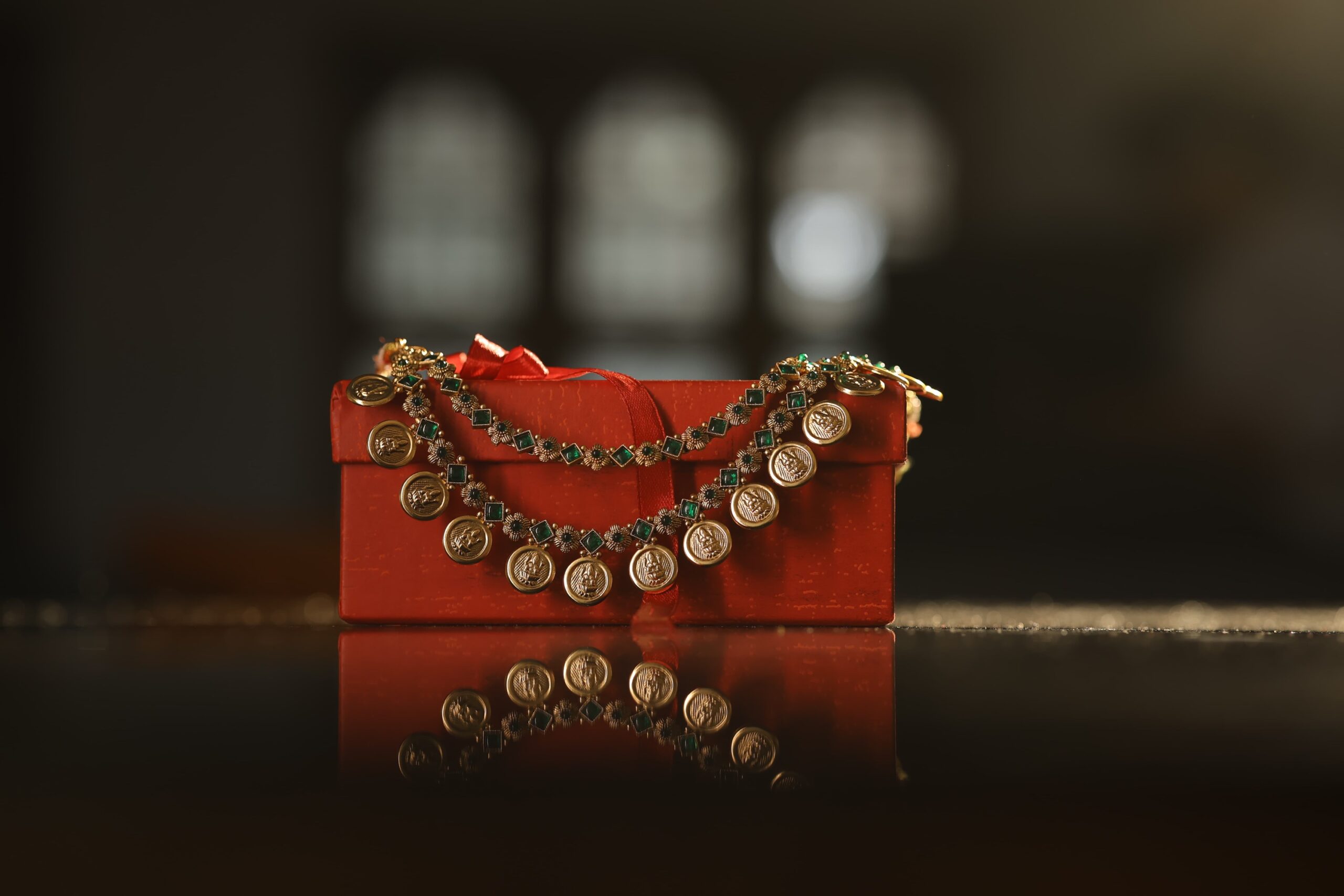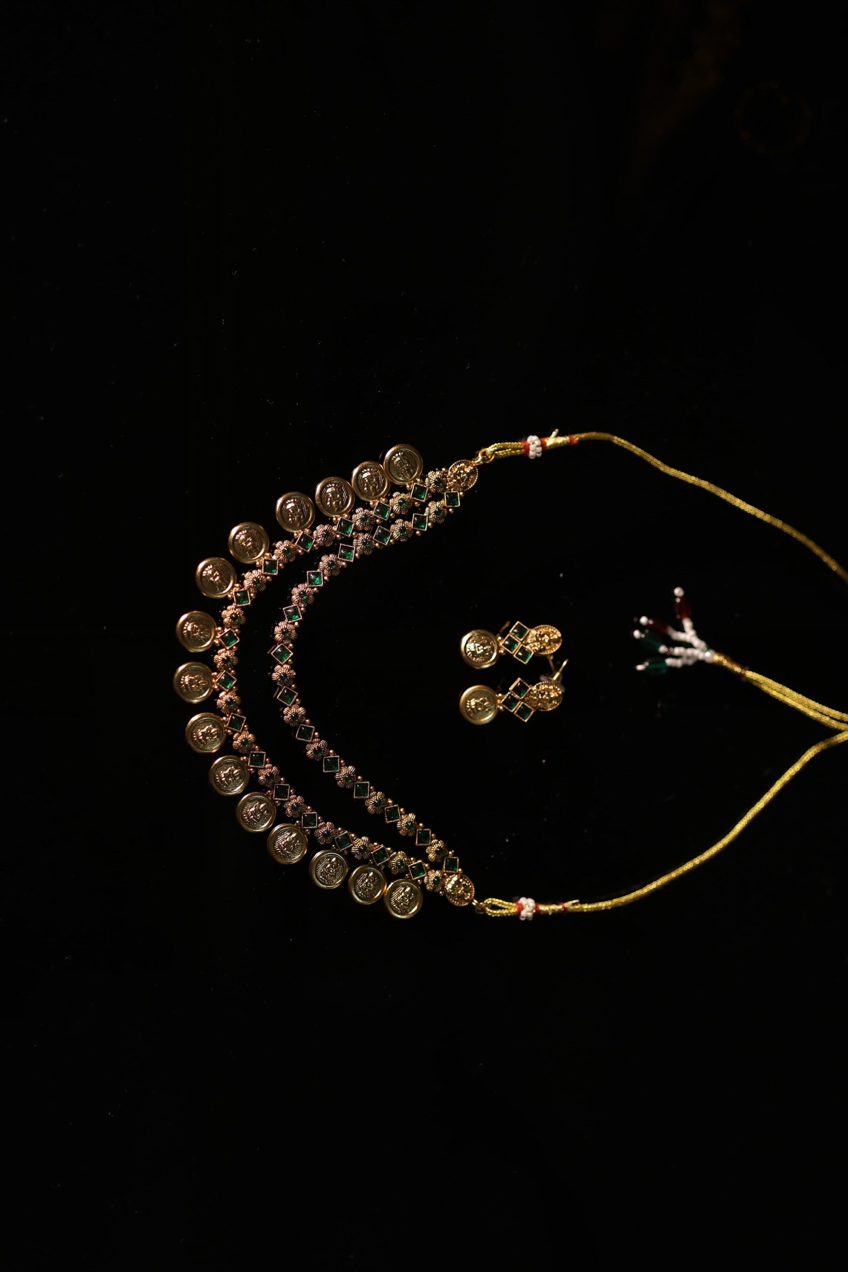 This elegant 2 Layer Coin Necklace Set features a beautifully layered traditional design inspired by classic South Indian temple jewellery. The necklace showcases two graceful layers adorned with intricately crafted coin motifs that symbolize prosperity and heritage. The upper layer is highlighted with delicate green stone accents, while the lower layer features a series of detailed coin pendants that create a rich and eye-catching look. The combination of temple-style craftsmanship and layered elegance makes this necklace perfect for festive occasions, cultural celebrations, and traditional attire.