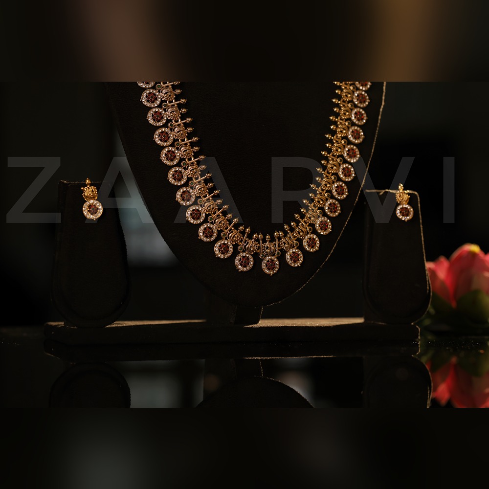 This elegant Ajrang Gold Plated Artificial Stones Studded Bottu Mala Haram Jewellery Set features a classic South Indian bridal design known as the Bottu Mala. The necklace set is beautifully crafted with a series of circular bottu motifs, each adorned with sparkling artificial stones that add brilliance and traditional charm. The layered design creates a rich and graceful appearance, making it perfect for weddings, bridal wear, and festive occasions. The set includes a shorter necklace, a long haram, and matching earrings for a complete coordinated look.