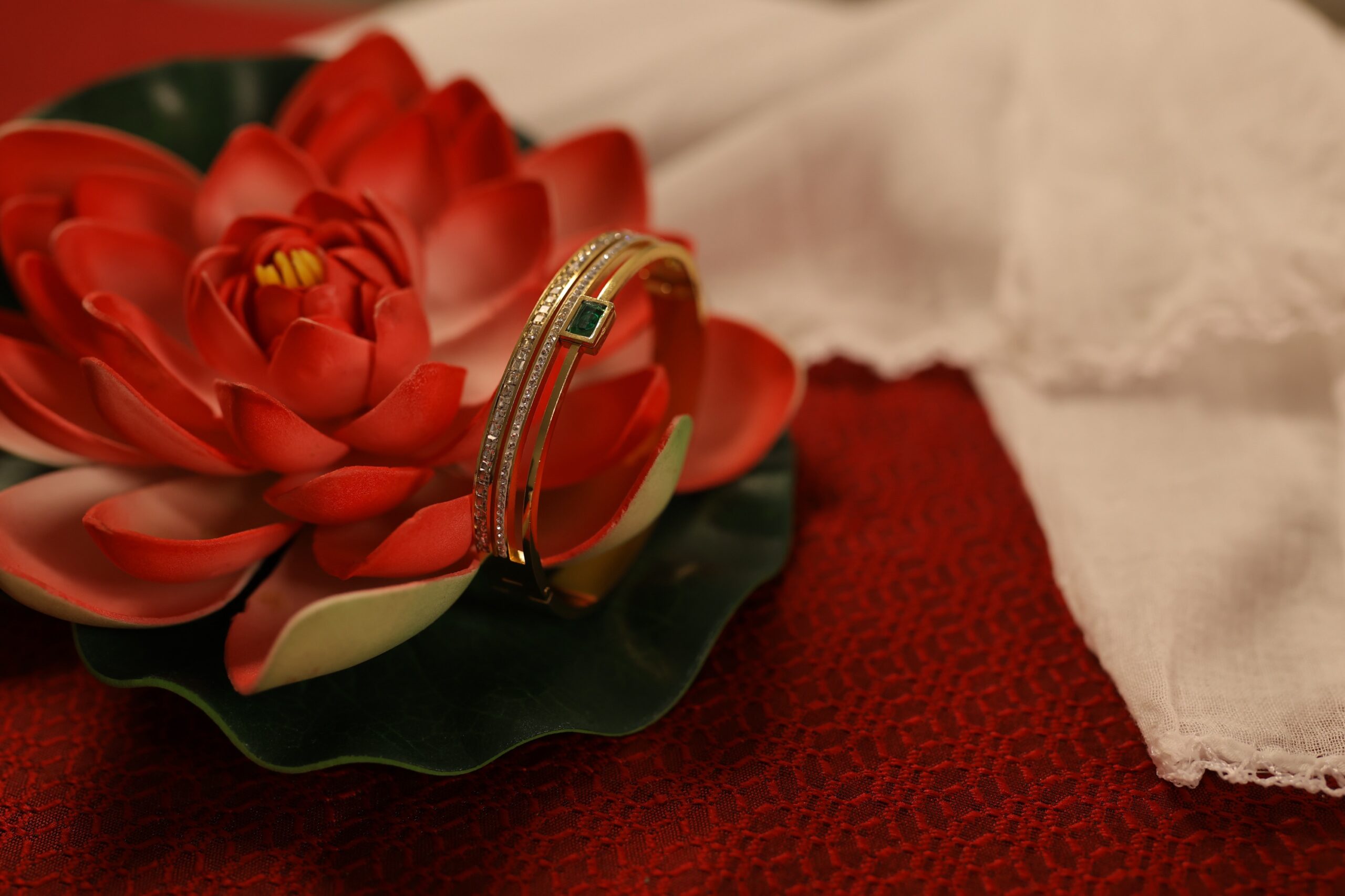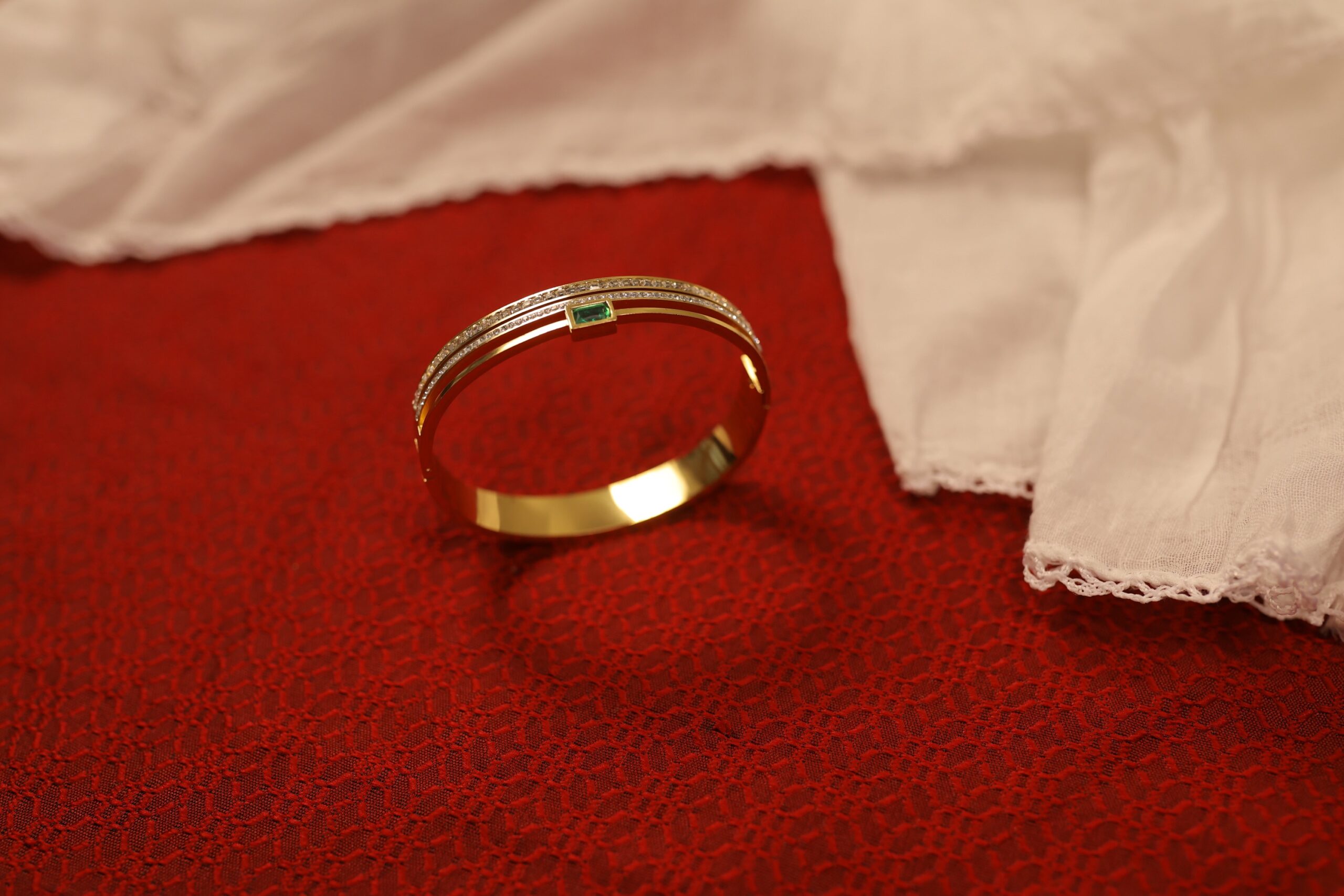 Design: Modern bangle featuring a green emerald-cut stone with dual rows of cubic zirconia accents.