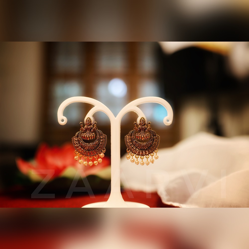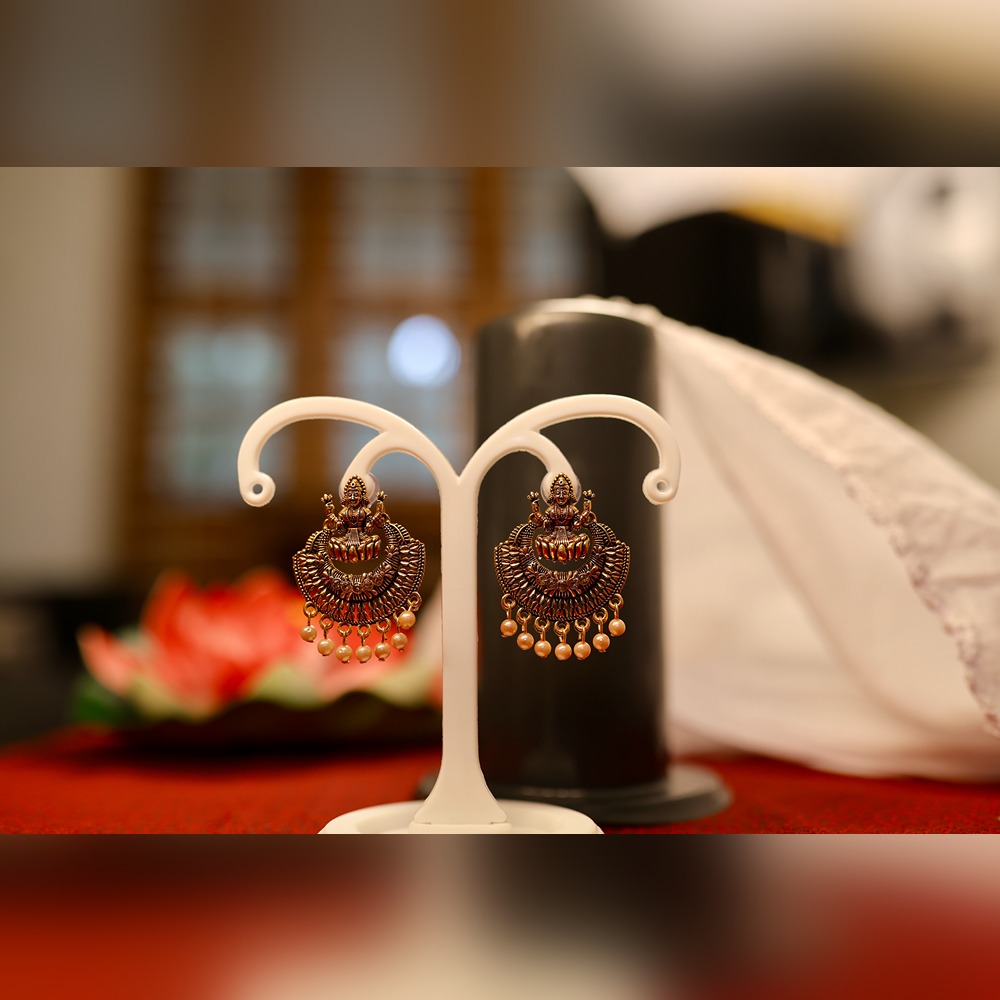 These elegant Chandbali Earrings with Pearl Drops feature a classic crescent-shaped design inspired by traditional temple jewellery. The centerpiece showcases a beautifully detailed Goddess Lakshmi motif, symbolizing prosperity and divine blessings. Crafted with an oxidised bronze finish, the intricate patterns highlight the rich heritage style of the earrings. The delicate pearl drops at the bottom add graceful movement and enhance the overall charm, making these earrings perfect for festive occasions, weddings, and traditional attire.