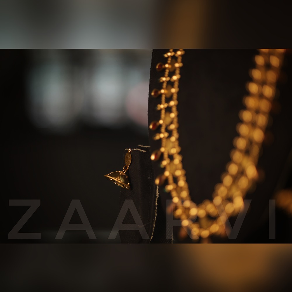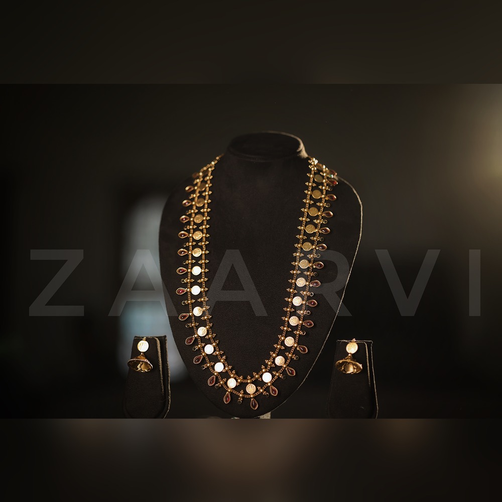 This traditional Coin Ruby and Emerald Haram Set features a classic South Indian temple jewellery design inspired by the timeless Kasu Mala (coin necklace) style. The long haram is beautifully adorned with a series of intricate coin motifs along the chain, symbolizing prosperity and heritage. Elegant ruby-red teardrop stones and subtle emerald-green accents are placed throughout the design, adding richness and vibrant contrast. Paired with matching jhumka earrings, this set creates a graceful and regal look perfect for weddings, festive occasions, and traditional attire.