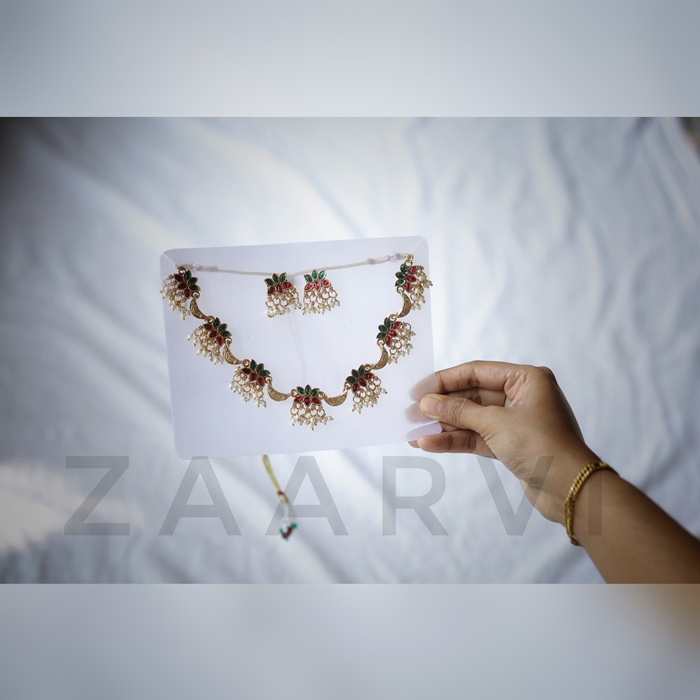 Design: Lotus motif pattern with red and green stone embellishments and pearl-like bead drops.