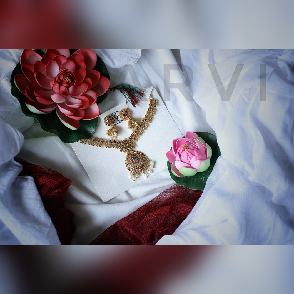 This elegant Gold Plated Necklace Set features a beautifully crafted traditional design highlighted with intricate detailing and colorful stone embellishments. The necklace showcases a graceful arrangement of small decorative elements that lead to a statement pendant with delicate bead drops, giving it a rich and festive appearance. The combination of traditional patterns and vibrant stones adds a royal charm, making it perfect for weddings, festive occasions, and ethnic celebrations. Paired with matching drop earrings, this set completes a sophisticated traditional jewellery look that pairs beautifully with sarees, lehengas, and other ethnic outfits.