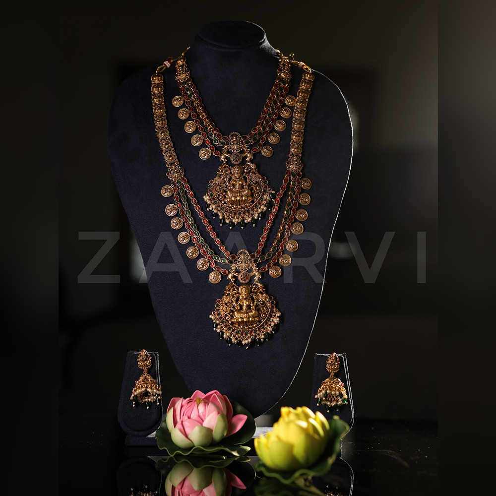 Design: Traditional South Indian temple jewellery with Lakshmi pendants, coin motifs, ruby and emerald stone accents.