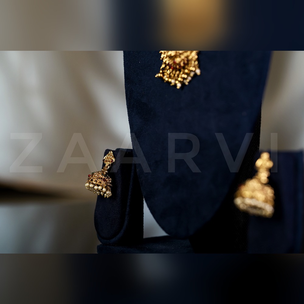 Earrings: Comes with matching temple-style jhumka earrings with pearl drops.