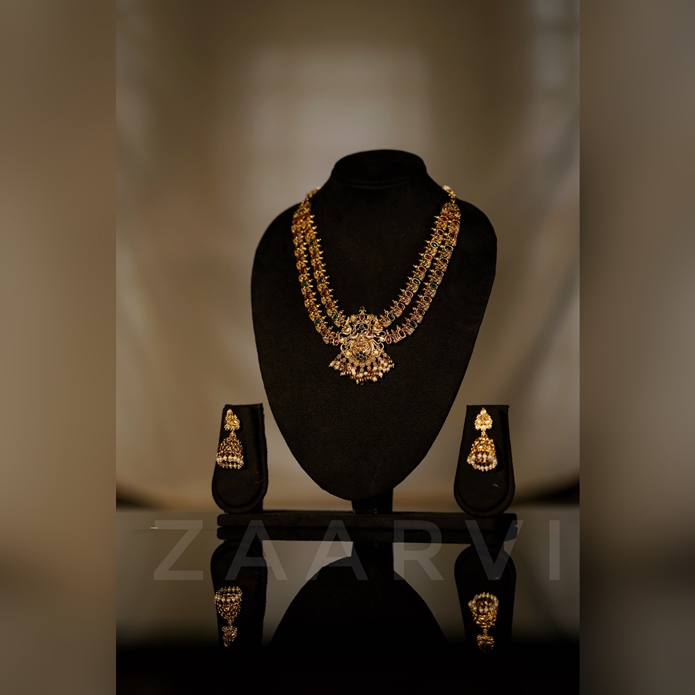 Design: Traditional temple-style pattern with intricate carvings, stone embellishments, and bead drops.