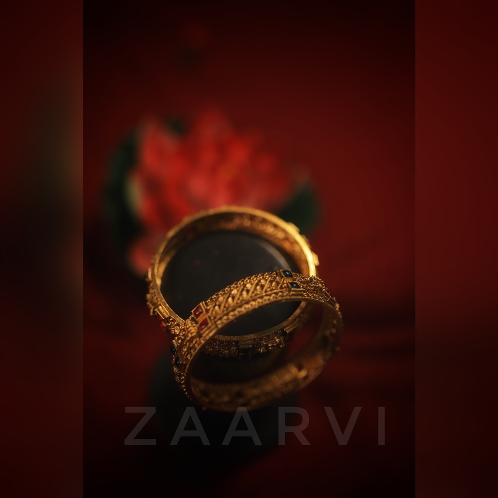 This elegant pair of Traditional Bangles showcases a timeless Kadakan Vala design inspired by classic South Indian heritage jewellery. Crafted with a rich gold alike finish, these bangles feature intricate detailing with finely carved patterns and subtle multistone accents in red and green hues. The traditional craftsmanship and textured design give it a regal and vintage appeal, making it a perfect accessory for weddings, festive occasions, and ethnic wear.