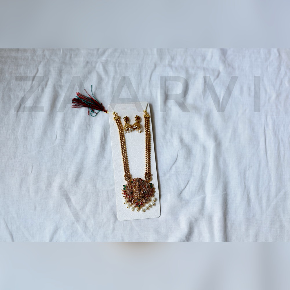 This bold and regal Adjustable Long Haram Necklace Set features a striking traditional design inspired by classic South Indian temple jewellery. The long chain is beautifully detailed with intricate gold-toned beadwork, leading to a grand central pendant adorned with multistone embellishments in vibrant red and green hues. The pendant showcases fine craftsmanship with delicate motifs and is enhanced with graceful pearl drops that add movement and charm. Paired with matching earrings, this set creates a regal and festive look, making it an ideal choice for weddings, cultural celebrations, and traditional occasions.