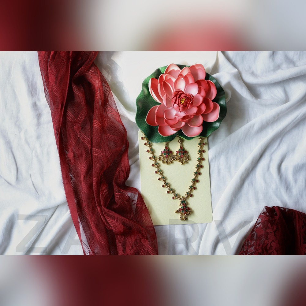 Earrings: Comes with matching drop earrings with ruby and emerald stone detailing.