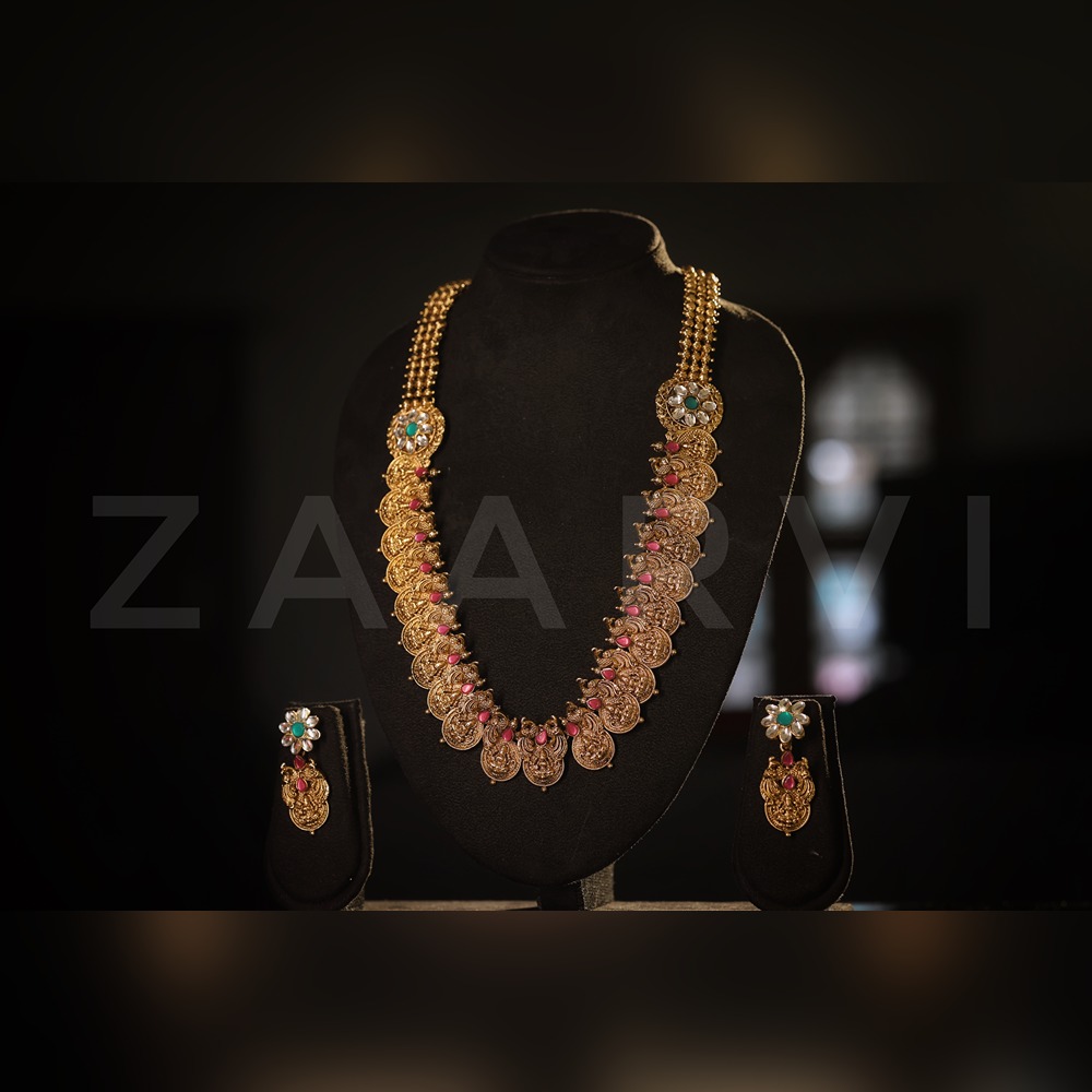 This magnificent Traditional South Indian Gold Lakshmi Coin Haram showcases a timeless temple jewellery design inspired by classic South Indian craftsmanship. The long haram is beautifully adorned with a series of intricately carved Lakshmi coin motifs arranged along the chain, symbolizing prosperity and divine blessings. The design is enhanced with delicate red and green stone accents and detailed gold-toned craftsmanship, giving the piece a rich and regal appearance. Paired with matching traditional earrings, this elegant haram set is perfect for weddings, festive occasions, and cultural celebrations, complementing sarees and other traditional attire beautifully.