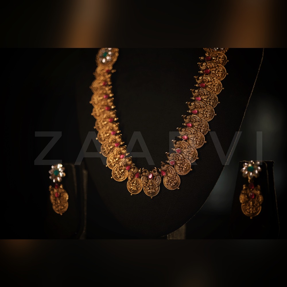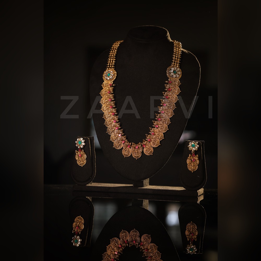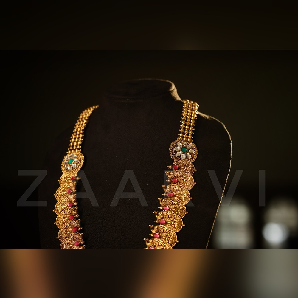 Finish: Antique gold plated finish with Lakshmi coin detailing and stone embellishments.