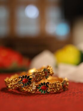 This elegant pair of Traditional Bangles showcases a vibrant and artistic design inspired by classic ethnic jewellery. Crafted with a rich gold-toned finish, these bangles feature beautifully detailed floral enamel work in lively colors, enhanced with pota stone accents that add a subtle sparkle. The intricate patterns and colorful detailing create a graceful and eye-catching look, making them perfect for festive occasions, weddings, and traditional wear.